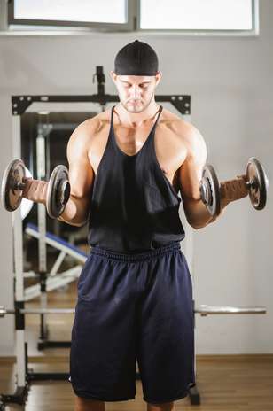 | Bíceps Rosca Simultânea: Em pé e com os braços ao longo do corpo, fique com as palmas das mãos voltadas para frente e segure halteres, sacos de alimentos ou elásticos. Flexione e estenda os cotovelos simultaneamente. São três séries, sendo as duas primeiras com 12 repetições e, a última, com oito. O intervalo é de 30 segundos entre elas |
